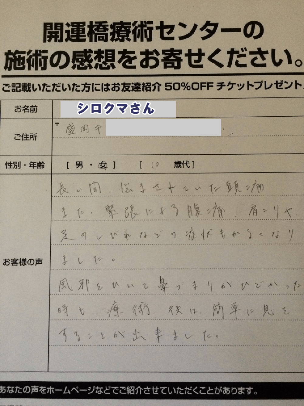 思い悩んでいた際、偶然目に開運橋療術センターの広告を見て療術センターを受診しました。2ヶ月で7回の施術を行った結果、痛みもかなり改善され、以前から飲んでいた痛み止めも現在は不要になりました。今後も時間を掛けながら完治を目指します。